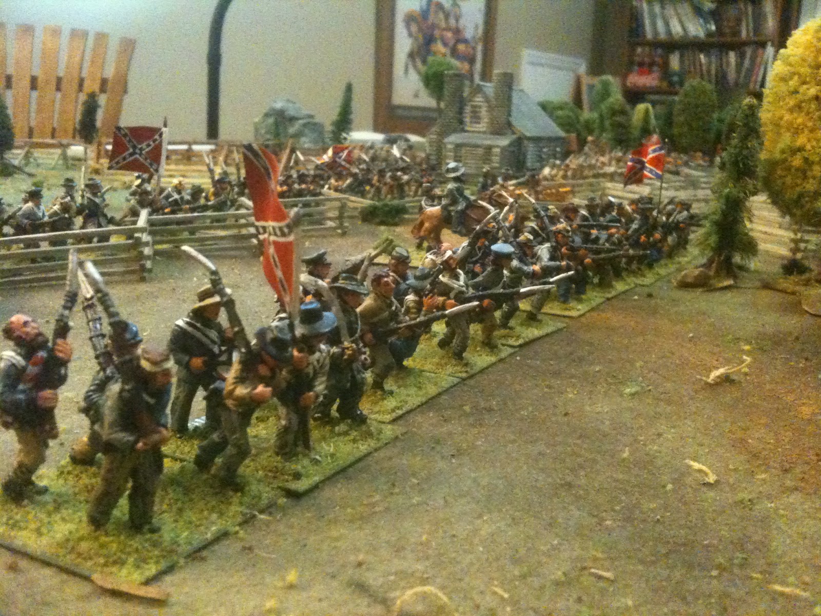 To reconcile these grand-tactical scale issues, close to twenty years ago I began to use 10mm buildings and fences with my 15mm figures (some N Gauge model railroad buildings also work). 10mm ACW buildings have a very small footprint, usually about one third that of a 15mm model of the same building, if not less. Even better, most are about half the height of an average 15mm building. Sure, this is till out of scale compared to the ground scale; however, like the 15mm buildings, 10mm buildings are just small enough not to appear conspicuously out of scale. The eye of the observer seems to adjust so as to view the tabletop scene as a whole, with the surface of the ground and/or woods taking center stage, visually. A few strategically placed 10mm farmsteads placed here and there actually enhances that sense of vast distance we're trying to convey. Moreover, a couple of small buildings gives a farmstead a more interesting and realistic appearance than is the case if representing it using one towering, incongruous edifice.